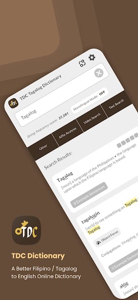 이 Tagalog-English Dictionary는 Tagalog / Filipino 언어를 염두에두고 구축하여 고급 접미사 분석 엔진을 포함하여 온라인으로 사용할 수있는 다른 Tagalog 사전보다 더 나은 검색 결과를 제공합니다.